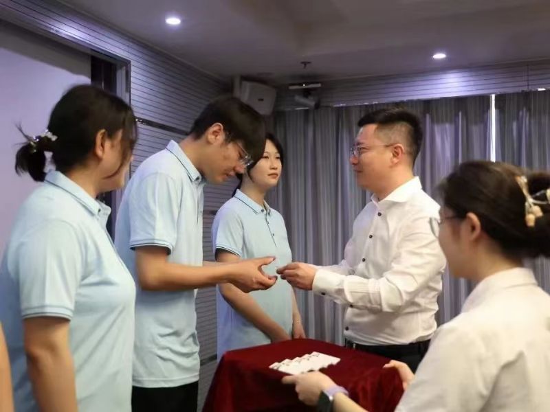 伴隨著激昂的音樂,入職儀式進(jìn)入了發(fā)放工牌的環(huán)節(jié)。國芳集團(tuán)各位領(lǐng)導(dǎo)面帶微笑,將蘊(yùn)含著公司信任與期望的工牌并伴手禮交到新員工手上,工牌在燈光的照耀下,折射出他們堅定的信念和對新征程的信心。
